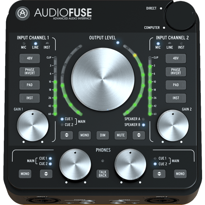 De Arturia AudioFuse Rev 2 audio interface heeft een flinke upgrade gekregen! Het dynamisch bereik is verhoogd naar 131.5 dB en de DiscretePro preamps zijn verberterd. De interface heeft -ondanks zijn compacte formaat- behoorlijk wat aansluitingen: twee microfoon en instrumenten inputs, vier analoge uitgangen, ADAT, S/PDIF, twee RIAA phono preamps, word clock i/o, MIDI i/o en zelfs een USB-hub met drie ingangen om dongles, controllers en hard disks op aan te sluiten.