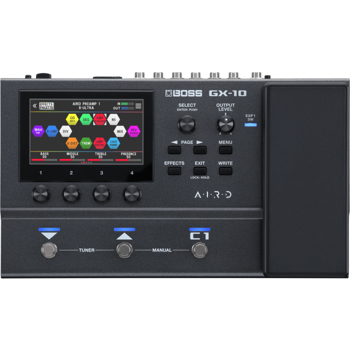 De nieuwe Boss GX-10 bevat alle krachtige GX-100 klanken in een compactere gitaar/bas processor met een kleuren touch display, multifunctionele voetschakelaars en een ingebouwd expressiepedaal.
