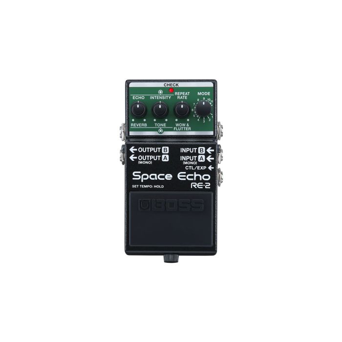 - Controls: MODE, REPEAT RATE, WOW & FLUTTER, INTENSITY, TONE, ECHO, REVERB, CARRYOVER en Pedal Switch.