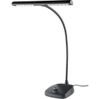 Zwarte kunststof pianolamp met 18 heldere LED-lampjes. Deze lamp is warm wit en dimbaar. Deze is eenvoudig in hoogte verstelbaar door een flexibele zwanenhals (26 cm) en daardoor ideaal op zowel een akoestische en digitale piano als op een klassiek orgel. De ronde verzwaarde voet heeft een diameter van 14,5 cm en de maximale hoogte is 37 cm. De lamp wordt geleverd incl. adapter.