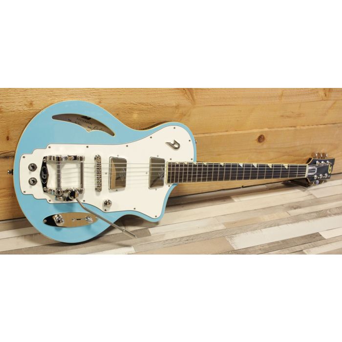 Onder de stijlvolle trapezium vormige pickup covers vind je een Duezenberg Splitking humbucker in de brug en een Domino P90 in de neck positie. Deze schakel je via een standaard 3-standen blade switch, maar de magie zit 'm in de twee toggle switches gelocaliseerd achter de tremolo; deze dienen respectievelijk voor de split van het Splitking element en een directe routing van het brugelement naar de output waarmee alles wordt ge-bypassed behalve het brugelement. Deze functie zou je prima kunnen inzetten als een "built-in solo switch" bijvoorbeeld!