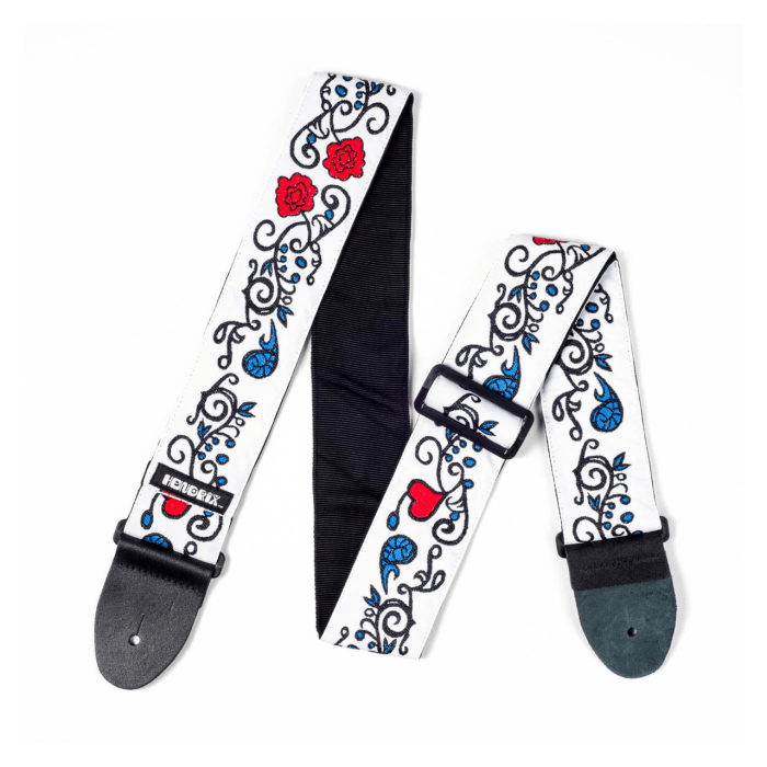 De Dunlop JH02 gitaarband is een eerbetoon aan het iconische optreden van Jimi Hendrix tijdens het Monterey Pop Festival in 1967, waar hij zijn Stratocaster in vuur en vlam zette. Deze band is onderdeel van de officiële Hendrix-serie van Dunlop en is ontworpen in samenwerking met Authentic Hendrix – beheerd door de familie van Jimi Hendrix. Elk detail, van het patroon tot het stiksel en materiaalgebruik, is zorgvuldig gecontroleerd en goedgekeurd.