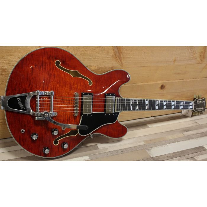 De T486B is een variatie op de T486. Vanzelfsprekend is deze "B" uitvoering voerzien van een Bigsby. Iets wat wellicht niet op het eerste gezicht opvalt, maar significant verschillend is van de reguliere T486, zijn de Seymour Duncan Phat Cat P90's. Dit geeft een totaal andere klank en karakter aan de gitaar want met de Phat Cat's klinkt de T486 ineens heel fris -bijna twangy zelfs- en open; een hele toffe poppy sound. Die Phat Cat's overigens, zijn P90's in het formaat van een gewone humbucker, dus mocht je op een later moment overwegen de gitaar te voorzien van humbuckers, dan is geen probleem.