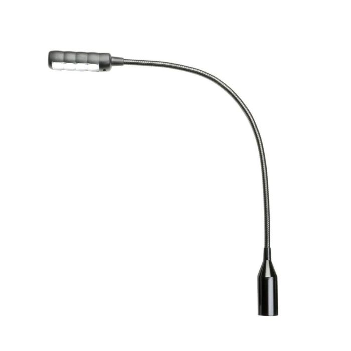The Adam Hall SLED 1 ULTRA XLR 4 is a black gooseneck light with 4 bright LEDs and a 4-pin XLR connector. It operates on 12 or 48 volt phantom power. The 30 cm gooseneck is both flexible and sturdy; the on/off switch is easily accessible on the head of the light. The four COB LEDs very bright and provide 40 lumens of daylight. Since these are LED bulbs, they last a very long time.