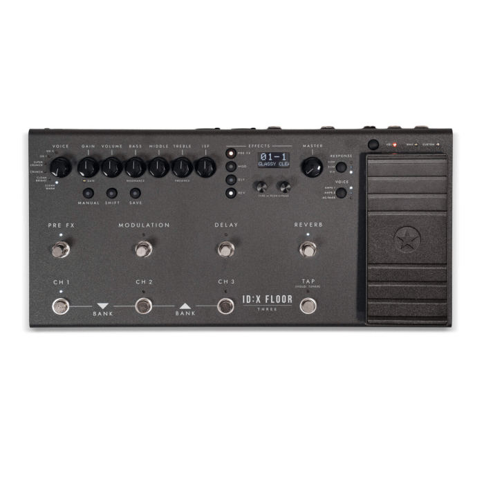 - Footswitches: CH 1, CH 2, CH 3, Tap Tempo (Tuner), Expression (pedal), Pre-FX, Delay, Mod and Reverb