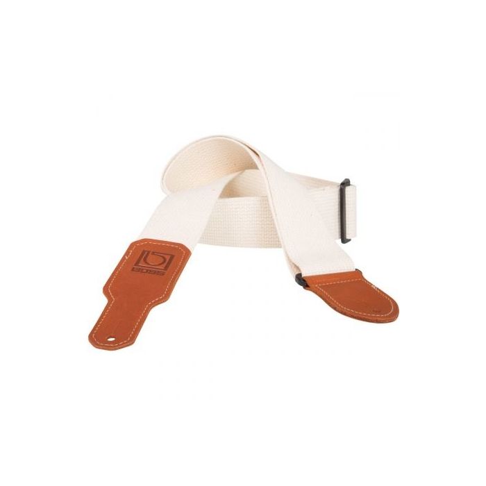 The BOSS BSC-20-BLK is a guitar strap 5 inches wide and adjustable in length from 115 to 142 inches long. This strap is white and made of woven cotton with nickel buckles and brown leather ends.