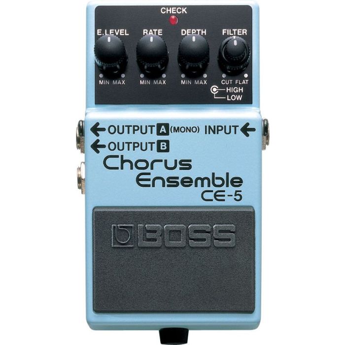 The BOSS CE-5 delivers sounds popular in today's music, from a mild, natural chorus to piercing stereo choruses. The CE-5 has both high- and low-cut filters and a wide frequency range.