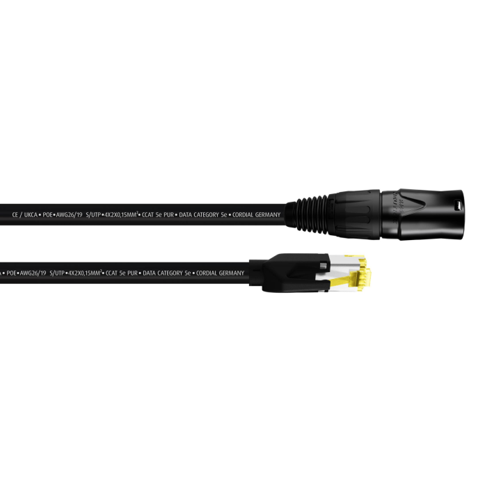Cordial CSE 5 NH 5e PUR data patch cable is constructed with CCAT 5e PUR bulk cable and Hirose RJ45 connectors, with one side featuring Neutrik etherCON connector protection. This cable features a flexible AWG 26/19 inner conductor and a special TPE-V stabilizer, making it very suitable for audio networking (Dante), lighting control and EtherSound systems.