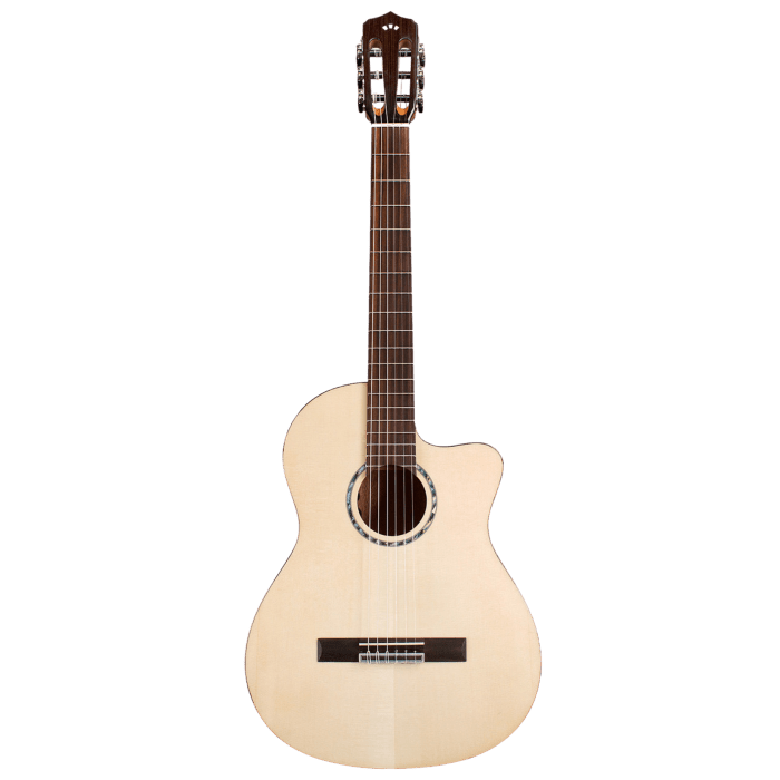 With the Fusion 5, Cordoba launches its Fusion series. The Fusion series offers a classical guitar with modern specs. This makes the transition from steel-string guitar to nylon-string guitar an easier one. The Cordoba Fusion 5 features a solid spruce top, (laminated) mahogany sides and back, side dot position markers, a cutaway and a modern looking pearl rosette