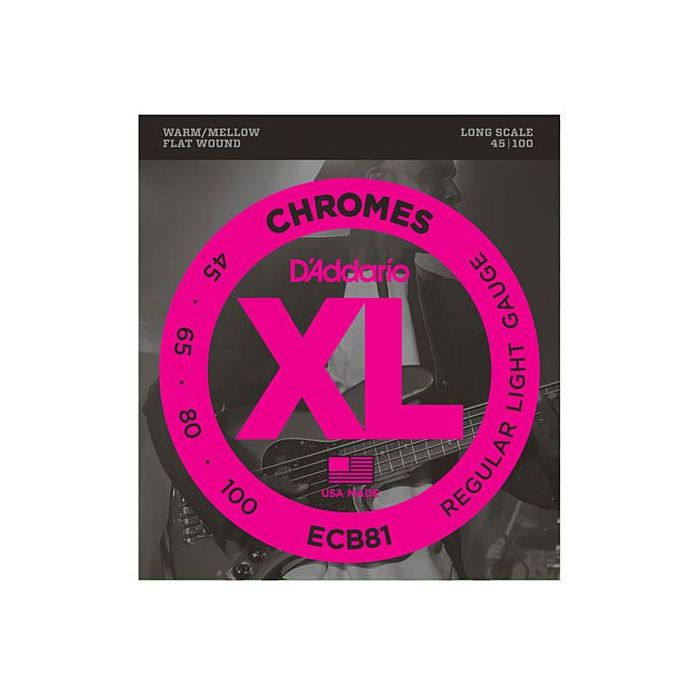 XL Chromes are among the warmest, softest bass strings we have to offer. These flat-wound strings have an ultra-smooth feel and dark but warm tone, while allowing movement across the fretboard without finger noise. Made with a high-carbon steel core, Chromes stainless steel flat-wound wire is expertly wound on a series of interlocking lower windings, then meticulously polished for unparalleled smoothness and a tonal presence that blends beautifully into the mix. This 45-100 Regular Light set is a medium scale version of our best-selling bass gauge, known for its even tension, bright tone and tight low-end.