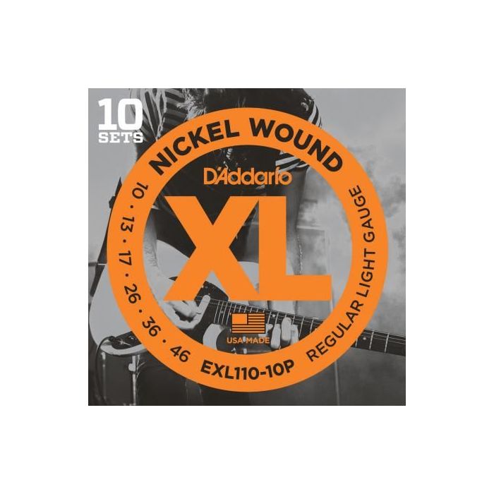 This "regular light" set contains the following gauges: 010-013-017-026-036-046. EXL110's are suitable for all types of electric guitars and we recommend using this thickness in regular E tuning, half step down (Eb) or Drop-D tunings. The six strings are easily distinguished by the iconic color code used by D'addario