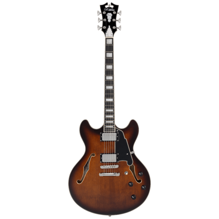 For the 2023 fall collection, the Premier Hollowbody Series has received a significant upgrade; these guitar now come standard with USA Supro Bolt Bucker pickups, a high-quality classic PAF style humbucker. In addition, D'angelico has taken the level of details and selection of materials even further. Striking details are the rosewood potentiometer knobs and the very dark, ebony-like, pau ferro used for the fretboard. Grover Super Rotomatic's are still standard on this latest version of the Premier. All in all, the difference with the more expensive Deluxe or Excel models has become even smaller! The classy Brown Burst looks very good!