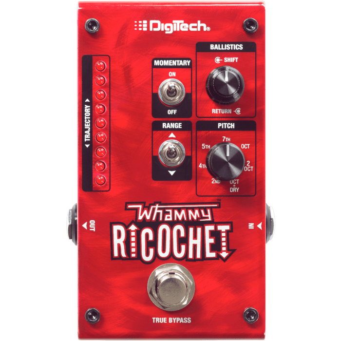 The DigiTech Whammy Ricochet is a compact pitch shifter with unique controls. Instead of the traditional expression pedal like the classic Whammy, the Ricochet works with a footswitch. This makes the pedal considerably smaller without sacrificing sound quality.