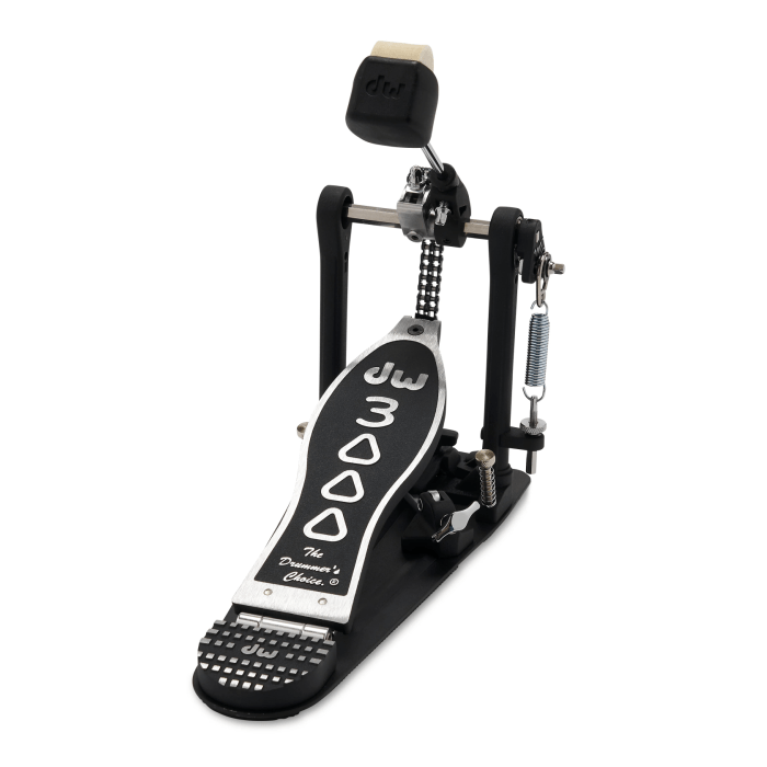 For over 50 years, DW has been the worldwide leader in hardware innovation. Every DW product launch has been followed with tireless innovation and the 3000 Series is no exception. The 3000 Series pedal offers innovative features and enhanced player functionality making it a smart, versatile choice for drummers of all skill levels and playing styles. Enjoy more features in the 3000 Series pedal than ever before. This all-metal, dual-chain single pedal has been updated with an Accelerator' cam, adjustable footboard angle, and swivel toe clamp. The steel base plate also now features an anti-skid rubber mat for greater stability.