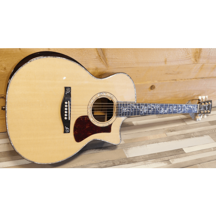 The finish combined with the beautifully detailed inlays and gorgeous bindings, makes this guitar look tremendously classy. The neck is mahogany with an ebony fingerboard that features beautiful "tree of life" inlays. Eye-catching new features are the ebony bevel cut and the extra projection sound hole in the top shoulder of the guitar. The former is fitted for playing comfort, the latter feature makes the guitar sound big and very rich and simply passes more tone to the player.