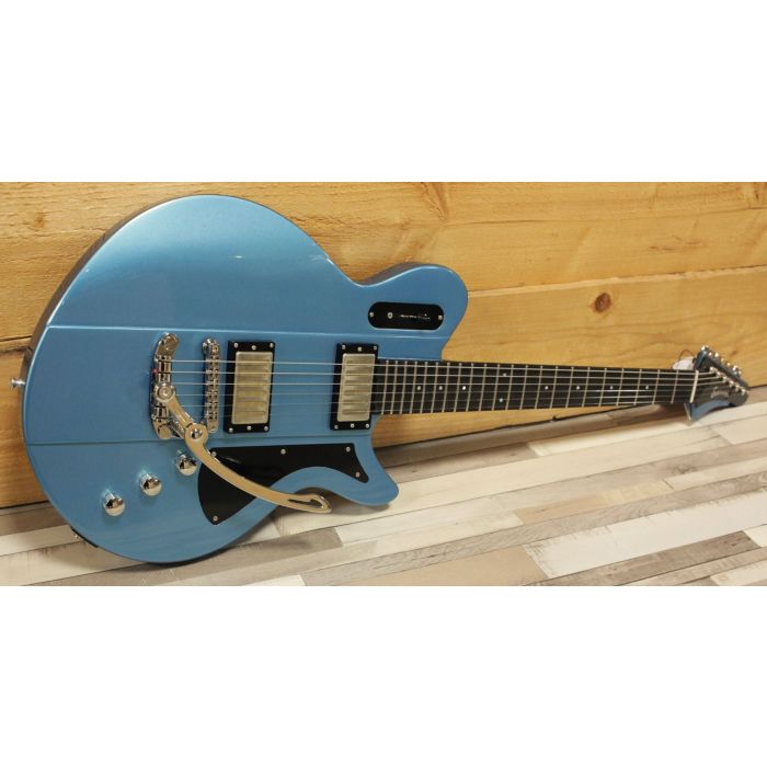 The Eastman Juliet LA Celestine Blue is a brand new model with offset body shape. The lover of the Eastman Romeo challenges you with it's graceful shapes and ergonomic body for maximum playing comfort. Nice detail is the raised centerpiece and headstock with a nod to Firebird guitars.