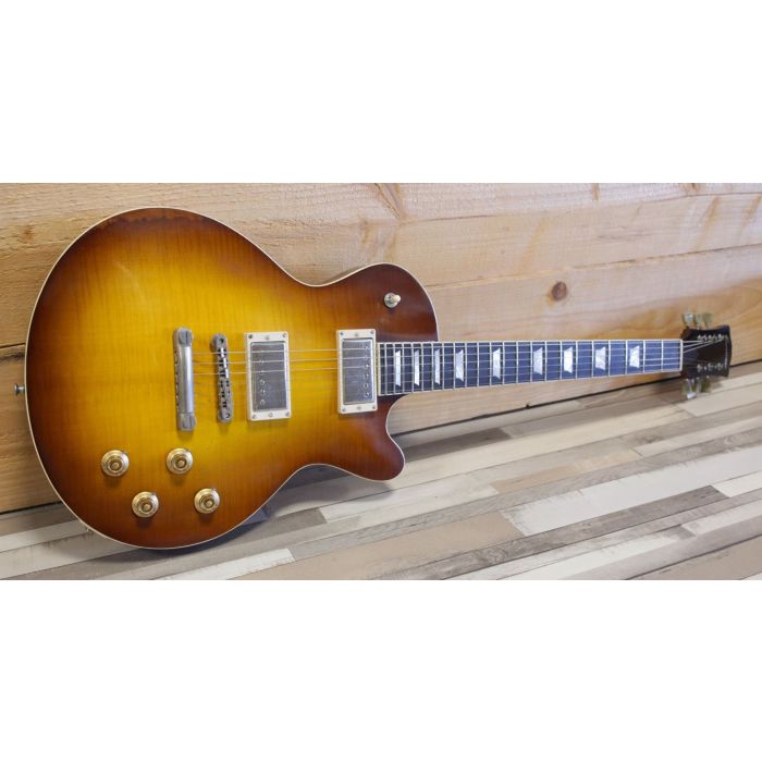 The SB59/v is made with a one-piece mahogany body with a solid, carved flamed maple top and has a scale of 24.75". The neck is made out of one-piece mahogany topped with an ebony fingerboard (12" radius) and Jescar frets. All hardware is by Gotoh, pots are by CTS and a Switchcraft jack connector is installed.