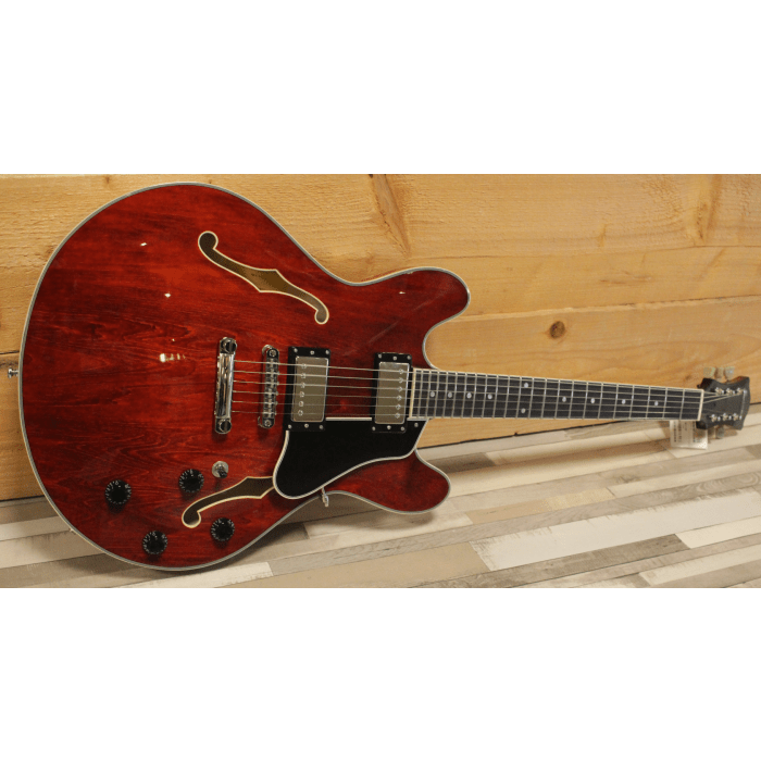 At the beginning of the range of electric guitars, you'll find this T386 from Eastman. An ES-style center block guitar that actually checks all the boxes; traditional looks, sound and specifications that are largely the same as those of the succeeding model, the T486, which differs in terms of its aesthetic bells and whistles and elements. The T386 has a laminated maple body with plain maple top, maple neck, ebony fingerboard and Kent Armstrong humbuckers. For optimal resonance of the wood, the T386 is finished with a True-tone finish; a very thin and acoustically transparent poly urethane-based lacquer developed by the prestigious Bourgeous Guitars.