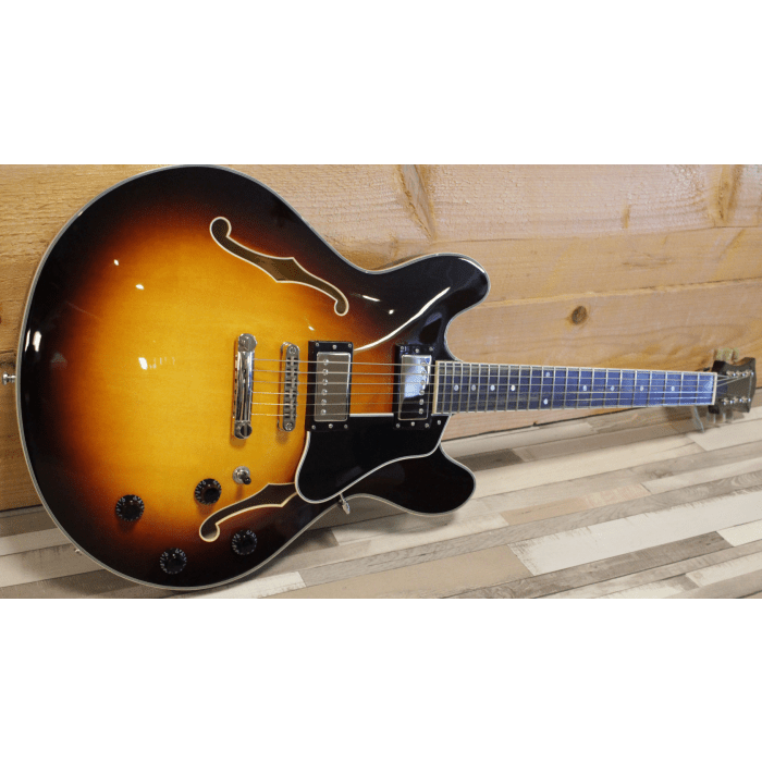 At the beginning of the range of electric guitars, you'll find this T386 from Eastman. An ES-style center block guitar that actually checks all the boxes; traditional looks, sound and specifications that are largely the same as those of the succeeding model, the T486, which differs in terms of its aesthetic bells and whistles and elements. The T386 has a laminated maple body with plain maple top, maple neck, ebony fingerboard and Kent Armstrong humbuckers. For optimal resonance of the wood, the T386 is finished with a True-tone finish; a very thin and acoustically transparent poly urethane-based lacquer developed by the prestigious Bourgeous Guitars.