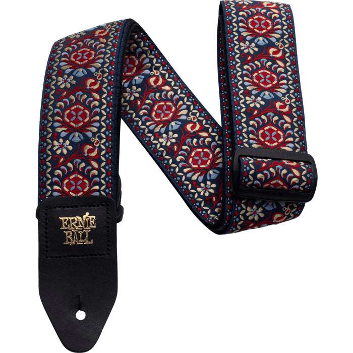 Ernie Ball guitar strap from the Classic Jacquard series with beautiful design and high ease of use for a small price. You can adjust the length from 104 to 182 centimeters. This comfortable polypro strap is five centimeters wide and features two leather end pieces with Ernie Ball logo.