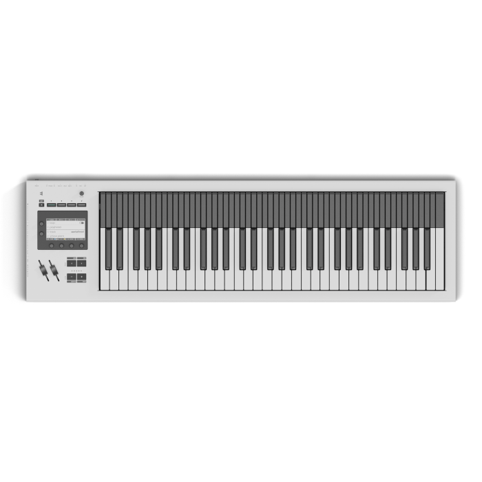 The white aluminum top combined with black housing gives the Osmosis CE a distinctive look. The control panel features seven encoders/buttons, nine knobs, pitch and modulation sliders and a 4.3-inch color display. In terms of connections, this controller offers DIN MIDI In, DIN MIDI Out/Thru, USB-C and two freely assignable pedal inputs. Power is supplied via USB-C Power Delivery.