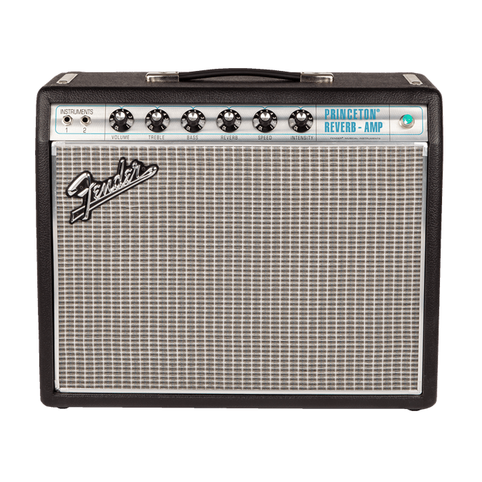 The Fender '68 Custom Princeton Reverb is a compact amp that delivers a mature tube sound including vibrato and reverb. This tube amp combo resembles the amps from 1968. This was a special year as the iconic Fender sound was combined with a new look. This results in a picture with a silver-turquoise front panel and an aluminum frame around the speaker cloth