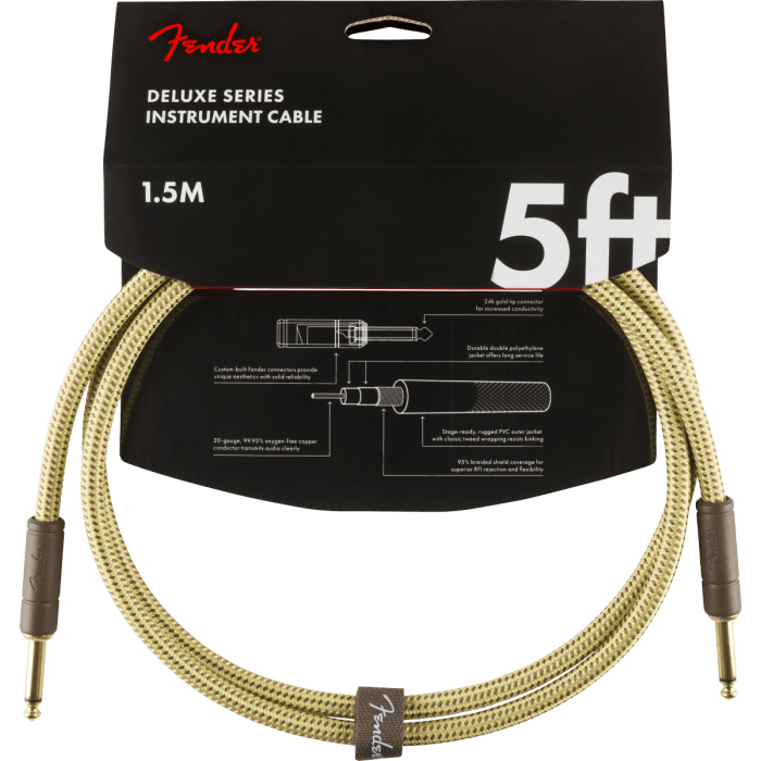 Fender Deluxe Series cables incorporate the highest quality materials and braided shielding to deliver industry-leading durability, conductivity and transparency. Our premium cables feature specially shaped ends with strain relief under the housing - plus 24K gold-plated connectors that won't degrade or deteriorate your sound over time. These cables use a very quiet braided shield designed to maximize the purity of your tone, and they are protected by a softly woven yet rugged tweed jacket that provides ultimate protection in classic Fender style.