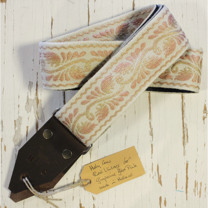 All fabrics used are real vintage (mostly 50's, 60's and 70's), intensively searched for and found in small batches of "new old dead stock" material in old local Dutch and Belgium fabric shops and warehouses. Due to this, 95% of straps are one-off in our collection as Holy Cow can make only a handful of the same straps from one piece of fabric. The fibers, velvets, patterns and the way they're woven many years ago goes perfectly hand in hand with the rock n roll appearances of a guitar and the old-school finishes we all still love. The leather for the end-taps is hand selected and hand cut as well.