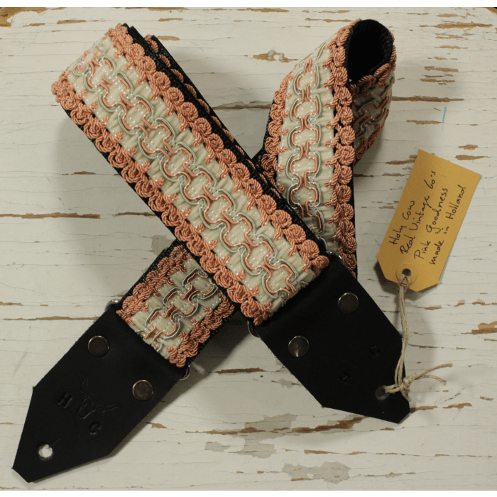 All fabrics used are real vintage (mostly 50's, 60's and 70's), intensively searched for and found in small batches of "new old dead stock" material in old local Dutch and Belgium fabric shops and warehouses. Due to this, 95% of straps are one-off in our collection as Holy Cow can make only a handful of the same straps from one piece of fabric. The fibers, velvets, patterns and the way they're woven many years ago goes perfectly hand in hand with the rock n roll appearances of a guitar and the old-school finishes we all still love. The leather for the end-taps is hand selected and hand cut as well.