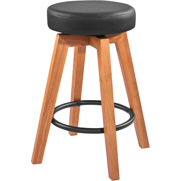 This elegant guitar stool is made of solid wood and finished in a natural color. The comfortable cushion made of black imitation leather has a diameter of 340 mm. Four sturdy wooden legs with felt glides provide a solid base and protect your parquet floor. The total height is 620 mm and the enveloping footrest allows you to play relaxing music.