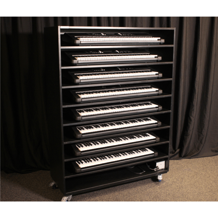 The Klundert Keyboard Cabinet system consists of a mobile, sturdy cabinet (black) containing 8 Yamaha PSR keyboards. The Yamaha PSR keyboards are provided by us with a battery so that they can be used without connecting cables (power supply / adapter). Ideal for a music room! No more messing around with cables and power adapters and the system is super fast ready for use (and also fast to clean up).