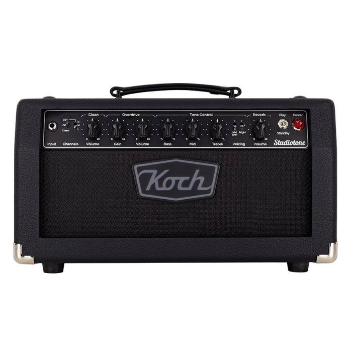 As with all Koch products, the Studiotone is never meant to be a budget amplifier that is loudly announced on the market. The Studiotone is meant for the professional guitarist who, with his guitar on his back and the Studiotone in his hand, can hop from job to job and do everything with that one amp. The Studiotone is a full tube amp based on a Class-A EL84 output stage of about 25 watts. The pre-amp has 3 channels (clean, OD and OD+) which share a three-band EQ. For the OD+ the intensity of the distortion can be adjusted separately and for extra voicing possibilities, the Studiotone is provided with mid-boost and bright switches. The amp also features a spring reverb and the speaker is a Koch custom design VG12-60 speaker.