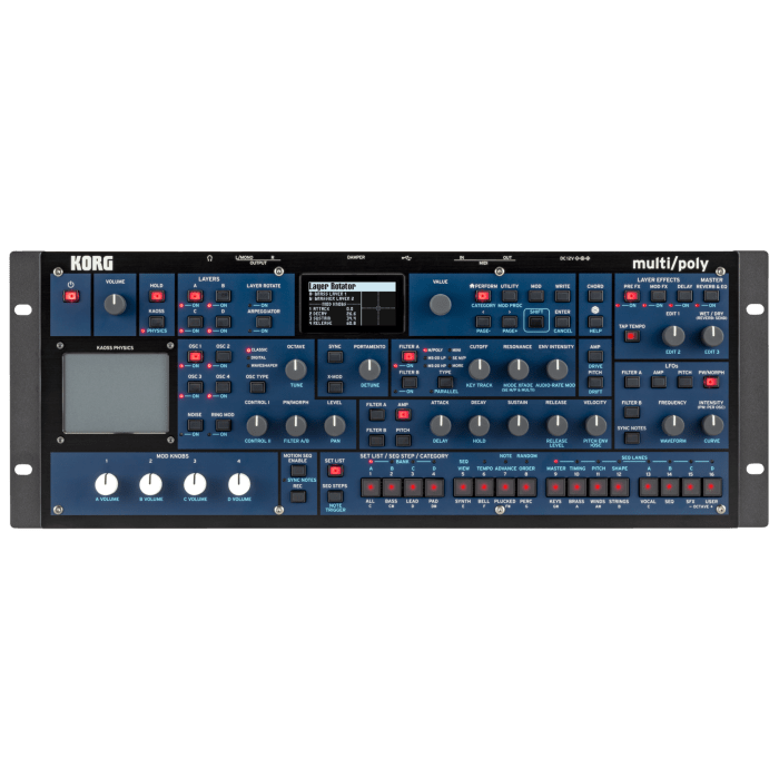 Inspired by the legendary Mono/Poly, the KORG multi/poly synthesizer module blends the rich, classic warmth of analog sound with advanced digital flexibility. Powered by KORG's next-generation analog modeling technology, it offers a unique mix-and-match multi-synthesis approach, allowing you to combine parameters of classic analog synths such as oscillators, filters, envelopes and portamentos, opening up endless creative possibilities for sound designers and musicians alike.