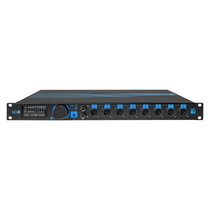 Housed in a rugged 19″ steel rack enclosure, the GO.8 offers a choice of 25-pin D-Sub or 6.35 mm TRS input connections, with D-Sub and XLR outputs. The XLR jacks on the front panel provide a DI signal with balanced microphone level, ideal for connection to a snake system. Transformer isolation effectively prevents hum and noise caused by ground loops. At the rear, D-Sub connectors provide balanced line-level connections.