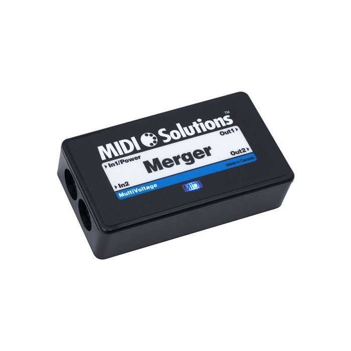 The MIDI Solutions MultiVoltage Merger merges all MIDI messages appearing on its two MIDI inputs into its two MIDI outputs. All types of MIDI messages are merged, including System Exclusive, MIDI Clock and MIDI Time Code messages. A fast merge algorithm ensures that all MIDI data is processed accurately with the least possible delay.