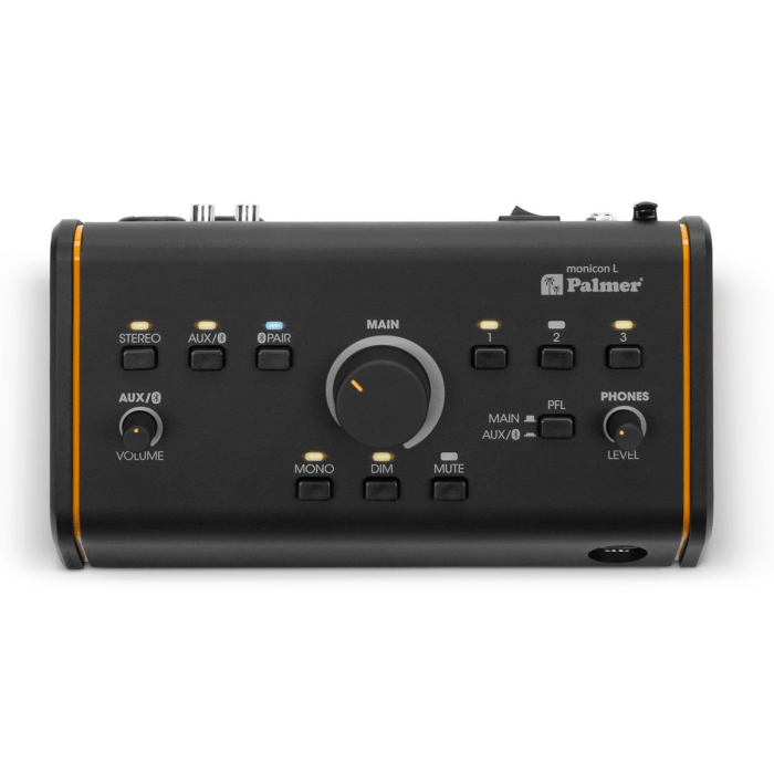 The Palmer MONICON L G2 is a compact monitor controller that fits perfectly in professional project studios and home studios. With three inputs - balanced via XLR/TRS combo jacks, AUX as well as Bluetooth - you effortlessly connect a variety of audio sources, from audio interfaces to mobile devices. All inputs and outputs are individually switched on or off via buttons with LED status indication.