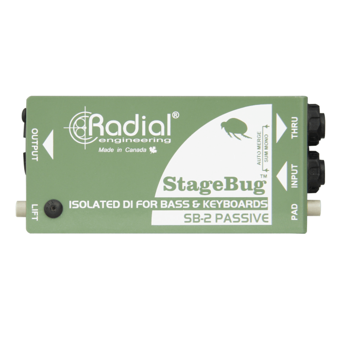 The Radial StageBug SB-2 is a passive DI box that provides a warm, classic sound reproduction of your bass guitar, keyboard or acoustic guitar. This compact DI is equipped with a special Eclipse ET-DB3 transformer that impedance-matches and balances the signal. At the same time, it effectively prevents hum and background noise caused by ground loops.