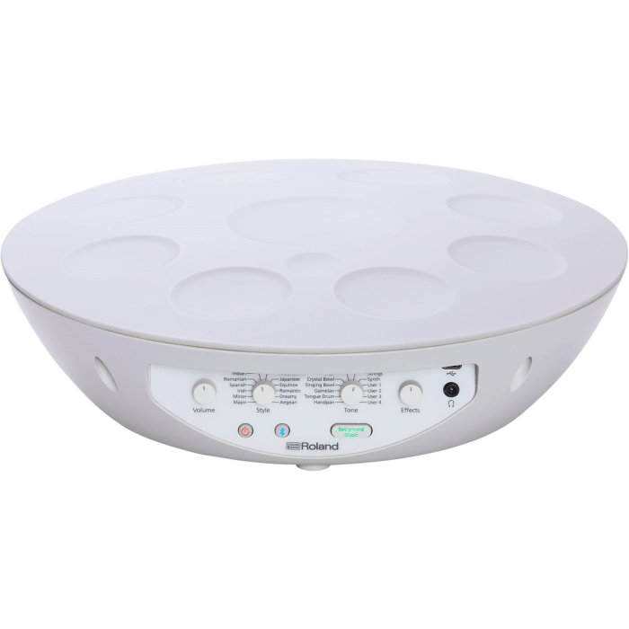 Mood Pan is made for mindful and modern musicians looking for a versatile and expressive instrument. It combines the authentic sound of acoustic handpans with all kinds of sound variations and other convenient features thanks to Roland's advanced percussion technology. Where most musical instruments require study and practice, anyone can enjoy the Mood Pan right away, without the need for experience or special techniques. The electronic design offers creative freedom without limitations. Explore different instrument sounds and tunings, add effects and play wherever you want. For quiet practice sessions, simply plug in headphones, which automatically mute the internal speaker.