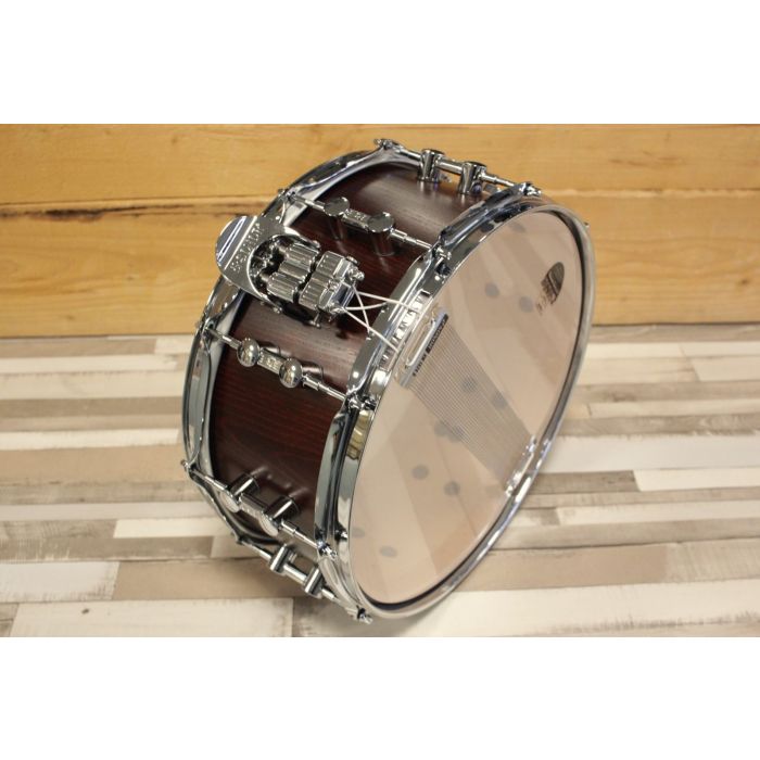 This Prolite snare has a 6 ply / 4 mm thick cross laminated maple shell with 3 ply / 2 mm thick reinforcement hoops and it's measuring 14x6" and is fully handmade in Germany. It has ten Sonor TuneSafe double lugs, Steel Power Hoops and Sonor Dual Glide throw off. Within the development process of all drums, Sonor spends extra time closely fine tuning dimensions vs materials; a process they call Optimum Shell Measurements (OSM). For example, Sonor shells are slightly smaller in diameter than the specified size, allowing the heads to resonate optimally.