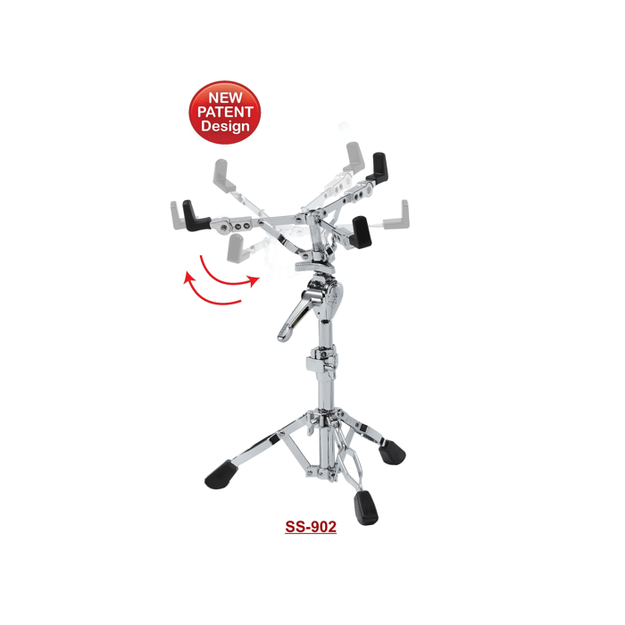 The Stable SS-902 is a snare stand for snare drums between 8 and 14 inches. A very solid stand, extra reinforced at the legs including rubber feet for extra stability. The snare can be put in a position by yourself by means of the maneuverable top