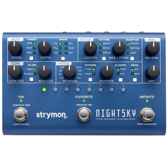 NightSky is a reverberant synthesis workstation, and a powerful, hands-on experimental sound design platform. NightSky gives you real-time continuous control of reverb pitch/processing rate/core size, harmonics, and even a synth-like resonant filter with multiple modulation waveshapes, plus a step sequencer with variable glide. You haven’t heard a pedal like this before.