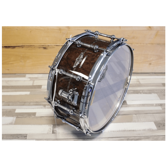 The shell is only 6 layers thick (5.5mm) with a beautiful "Claro Walnut" outer layer and features maple reinforcement hoops on the inside. This 14x6.5" snare is definitely an all-rounder and gives a nice mix of brightness ("cut through the mix"), body and a dry, woody tone.