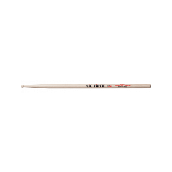 Vic Firth drumstick pair with barrel tip from the American Custom Maple Series. Relative to hickory sticks, maple sticks are somewhat lighter in weight (lower density) which allows for a refined playability, bounce and balance. In addition, maple has a different "wear behavior"; due to its texture, the wood has the property of "chipping" or splintering and typically breaks less quickly along the entire length of the stick.