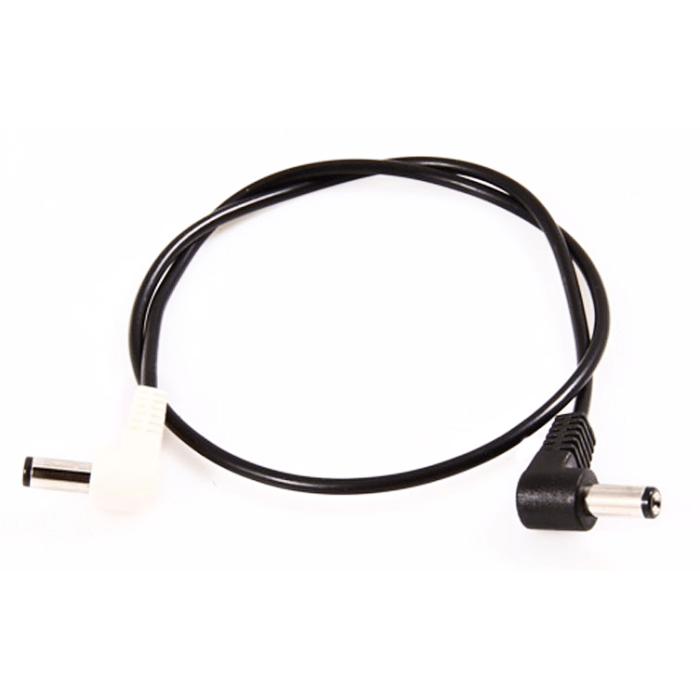 The cable has an angled plug and a white 2.1 mm barrel connection. This cable works with all Voodoo Lab power supplies and any other power supply that uses 2.1mm female outputs.