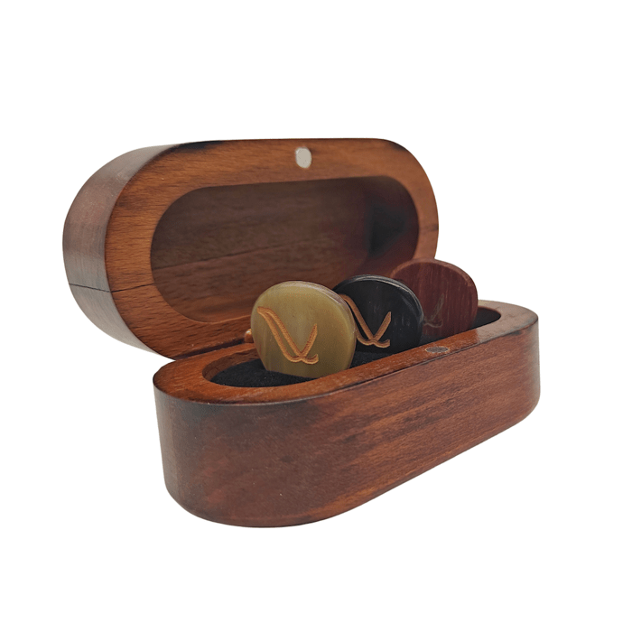 Whether for Christmas, St. Nicholas, Father/Mother's Day, birthday, Easter...we have the ultimate gift for the guitarist! Wambooka makes picks from specific materials. This Flat collection consists of three handmade thin picks (1.5 mm) of different materials. The whole thing is elegantly packaged in a beautiful wooden box whose lid closes with a magnet. In this box you can keep the picks tidy and closed or just show them in sight, because they should be seen!