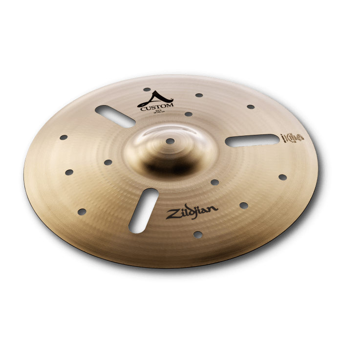 The A Custom EFX is a brighter version to the K Zildjian. This special effect cymbal features a unique laser "cut out" design that creates a dry, trashy sound, with sudden explosiveness and quick decay. Crash it for heavy, punctuating accents, or stack it with other cymbals to explore even more articulations, colors and effects. A Custom EFX cymbals come in a shimmering, brilliant finish and extra thin weight.