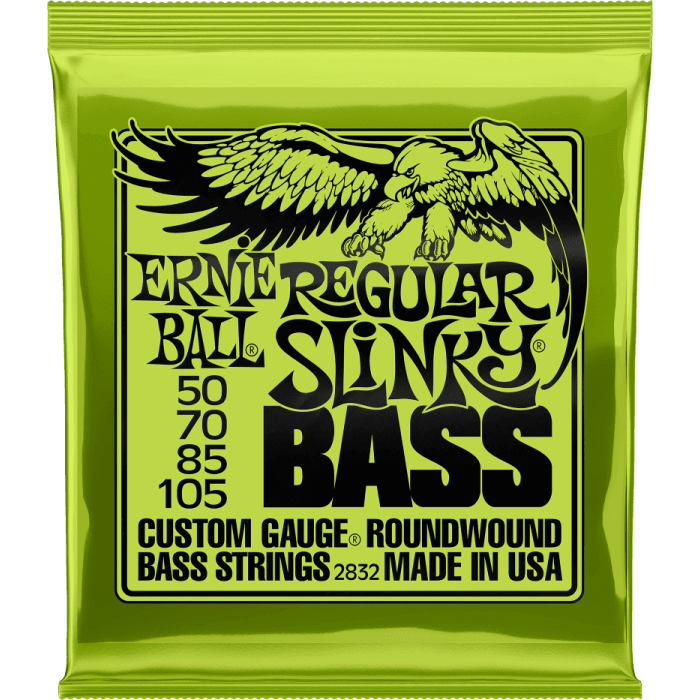 De Ernie Ball Regular Slinky 2832 is een snarenset voor een vier snarige elektrische basgitaar. Deze set bestaat uit vier snaren die gemaakt zijn vernikkeld staal en gewikkeld rond een zeshoekige stalen kern. De snaren zijn helder van sound met een serieuze punch. Zeer geschikt voor moderne rock- en popbassisten. Veel wereldberoemde bassisten kiezen voor Ernie Ball Slinky bassnaren!