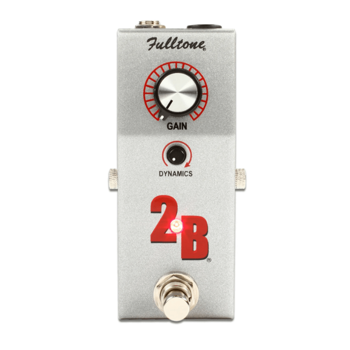 De Fulltone 2B is een klein, transparant en verbazingwekkend boost pedaal, ontstaan uit het "Boost" kanaal in het Fulltone FD3 pedaal. Fulltone heeft het circuit in de kleinst mogelijke behuizing gepropt, met de batterij er stevig ingestopt en zelfs ruimtebesparende IN, OUT en DC power jacks aan de achterkant geplaatst.