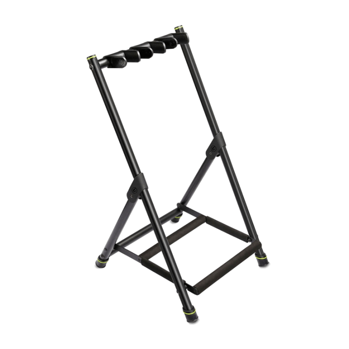 Kijk, dat ruimt lekker op! Ipv al je gitaren op een los statief kun je zo ook netje en veilig samen in één rack zetten. Deze stand biedt ruimte voor drie elektrische gitaren of één acoustische en twee elektrische gitaren of twee akoestische gitaren. De neck supports kun je naar eigen inzicht verstellen of verwijderen. De stand is in te klappen waardoor als een plat pakketje te vervoeren is. Alle beschermende materialen zijn weekmaker vrij en dus veilig voor alle laksoorten.
