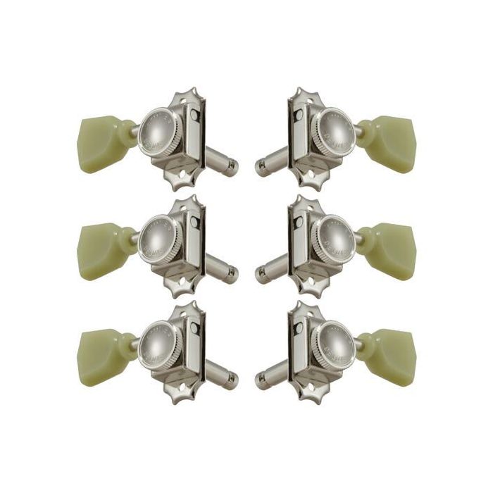 Grover Rotomatic locking tuners met vintage style Keystone Button. Set van 3-om-3 in nickel afwerking met classic Gibson fit. Ons favoriete kwaliteitsmechaniek om je Gibson of Gibson-style gitaar een technische upgrade te geven, zonder te tornen aan de vintage uitstraling van je gitaar.